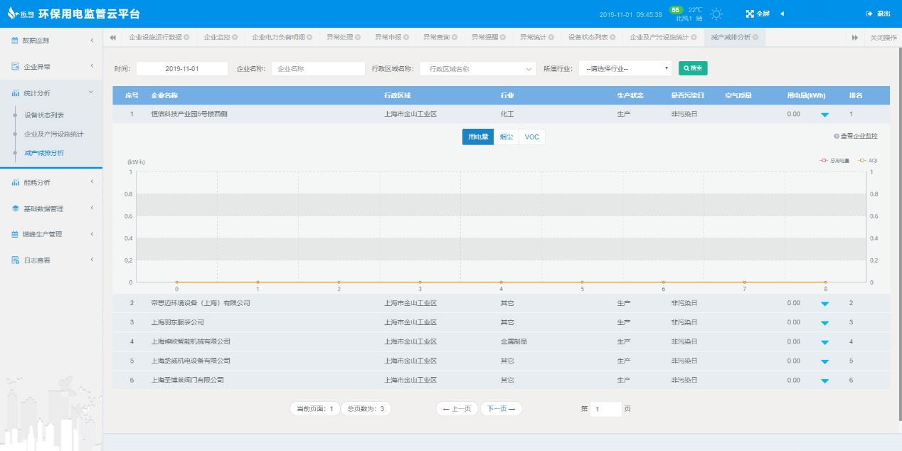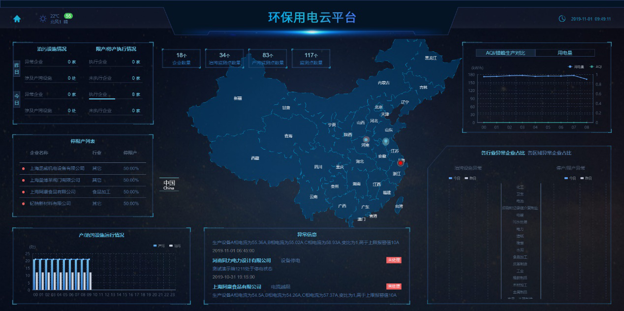 系統(tǒng)實(shí)時(shí)采集企業(yè)總用電、生產(chǎn)設(shè)備及環(huán)保治理設(shè)備用電數(shù)據(jù),通過關(guān)聯(lián)分析、超限分析、停電分析、停限產(chǎn)分析,及時(shí)發(fā)現(xiàn)環(huán)保治理設(shè)備未開啟、異常關(guān)閉及減速、空轉(zhuǎn)、降頻等異常情況,同時(shí)通過數(shù)據(jù)分析還可以實(shí)時(shí)監(jiān)控限產(chǎn)和停產(chǎn)整治企業(yè)運(yùn)行狀態(tài)。