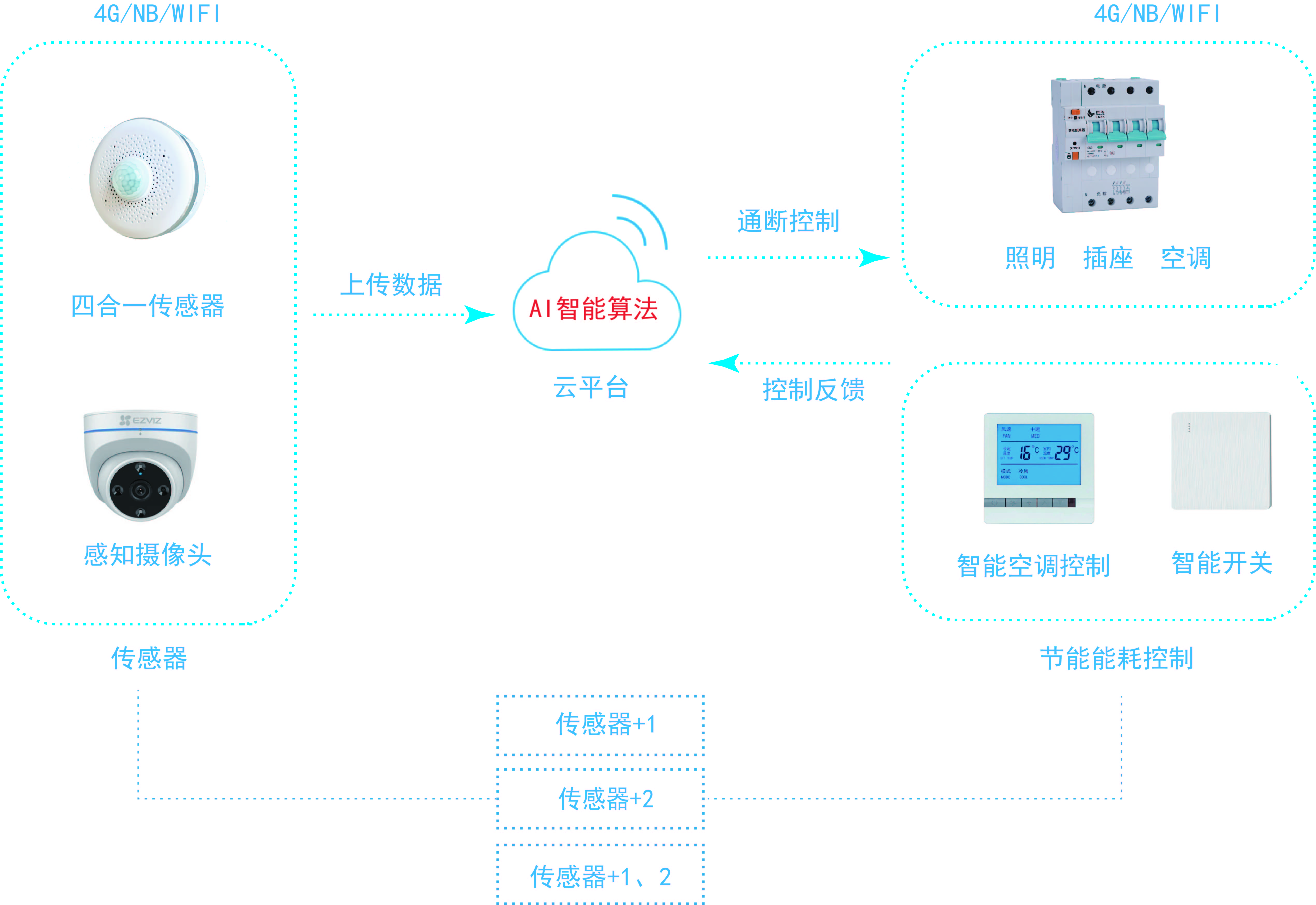 2、物理空間(房間)部署4合1傳感器,采集場景用電習(xí)慣數(shù)據(jù),上傳至用電節(jié)能云平臺(tái),通過AI算法聯(lián)動(dòng)節(jié)能通斷器進(jìn)行合理的用電場景通斷電控制。