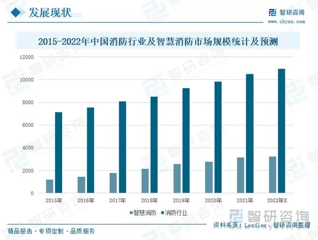 據(jù)Leadleo統(tǒng)計(jì),2015-2020年,我國(guó)消防行業(yè)以及智慧消防行業(yè)市場(chǎng)規(guī)模持續(xù)攀升,2021年,我國(guó)消防行業(yè)市場(chǎng)規(guī)模約10507億元,同比上升14.40%;智慧消防行業(yè)市場(chǎng)規(guī)模為3154億元左右,同比上升6.72%。