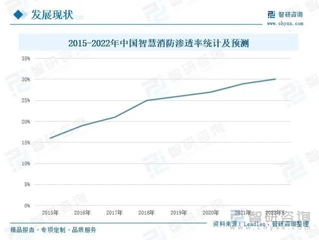 根據(jù)Leadleo相關(guān)統(tǒng)計(jì),2015-2022年,我國(guó)智慧消防滲透率呈逐年上升趨勢(shì),2021年,我國(guó)智慧消防滲透率為29%左右,同比上一年度上升了2個(gè)百分點(diǎn)左右。2022年,在國(guó)家智慧消防相關(guān)政策的推進(jìn)下,其市場(chǎng)滲透率將進(jìn)一步提升,預(yù)計(jì)達(dá)到30%左右。