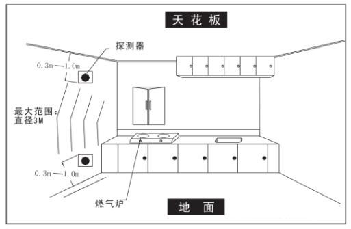 探測比空氣輕的氣體時:安裝于低于天花板0.3-1.0米,距氣源半徑1.5米內(nèi);