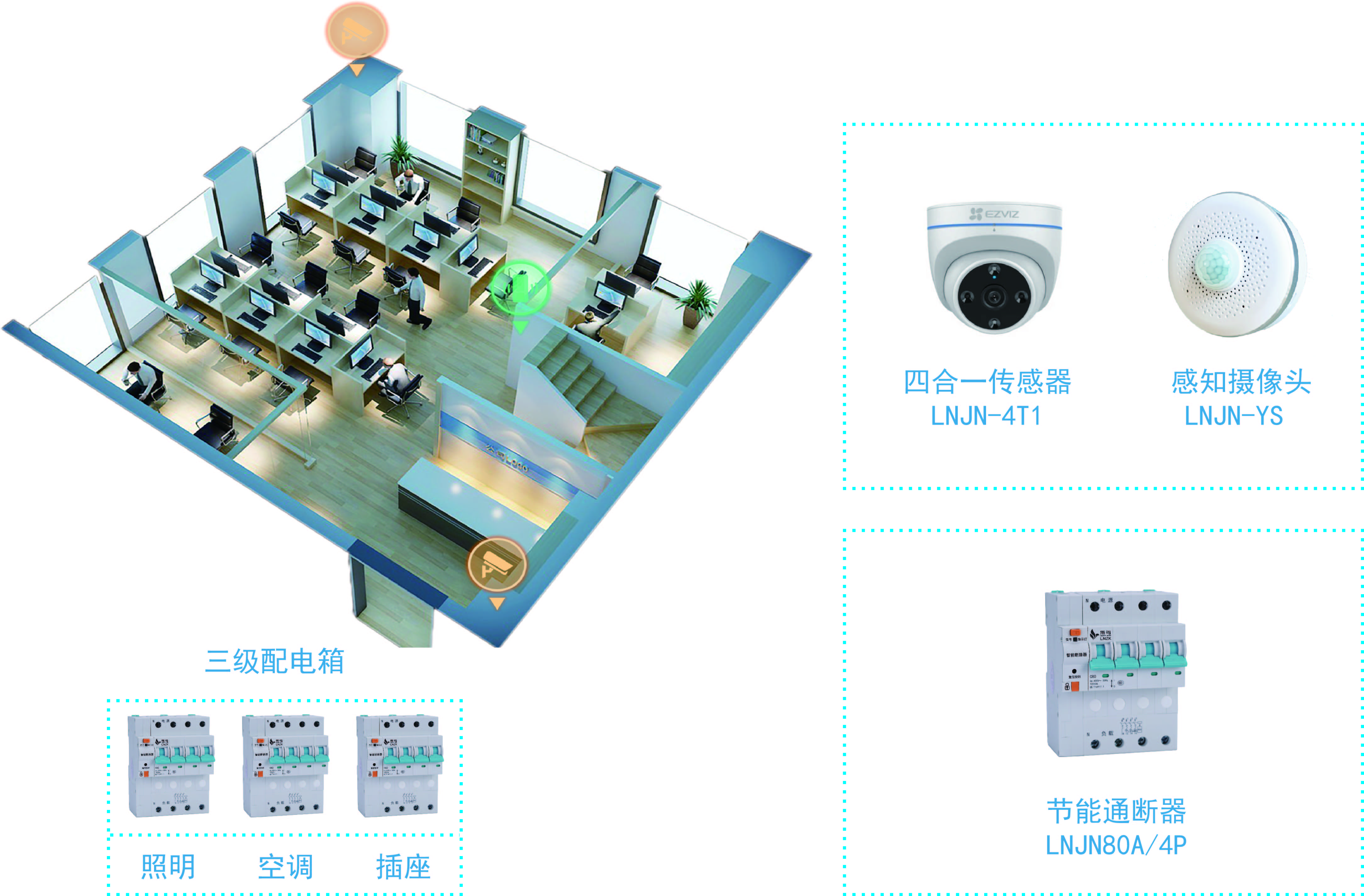 物理空間(房間)部署4合1傳感器與4合1傳感器采集場景用電習慣數(shù)據,上傳至Saas云平臺通過AI算法聯(lián)動節(jié)能通斷器進行合理的用電場景通斷電控制。