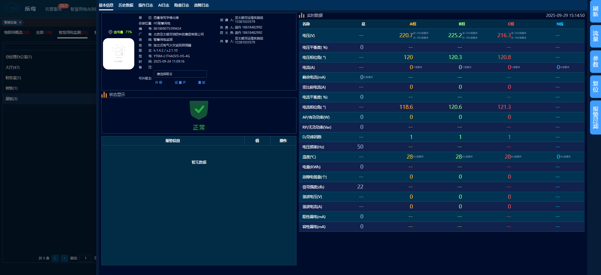 頁面呈現(xiàn)設(shè)備全部信息,涵蓋項目基礎(chǔ)資料、安裝位置、參數(shù)實時值、參數(shù)變化曲線及參數(shù)配置等內(nèi)容。支持對設(shè)備執(zhí)行刷新、調(diào)參、復(fù)位操作,并能對設(shè)備報警信息進行過濾處理。