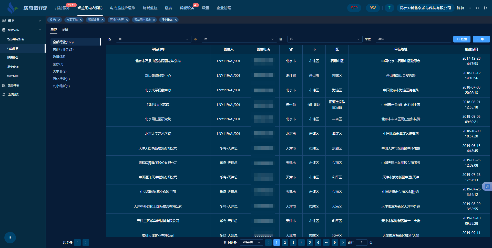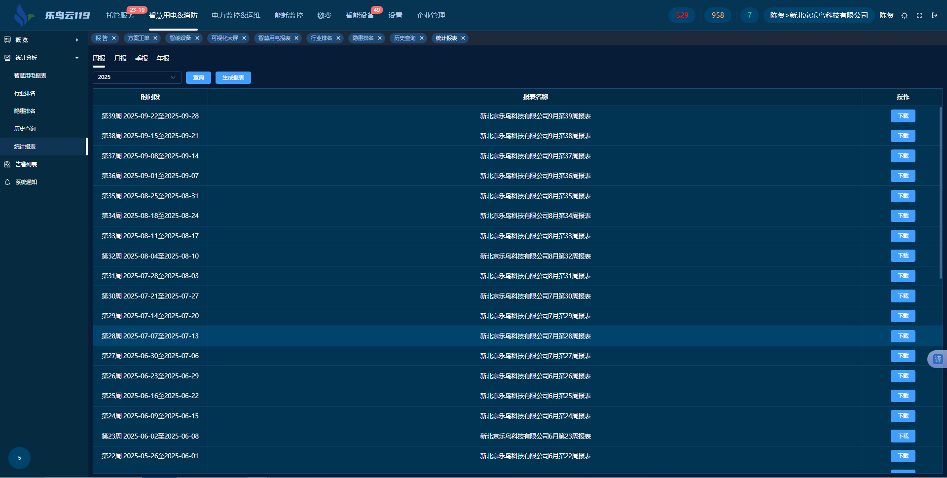 統(tǒng)計(jì)分析系統(tǒng)構(gòu)建多維度排名體系(涵蓋單位報(bào)警頻率、隱患類型、設(shè)備隱患、單位評(píng)分等),實(shí)現(xiàn)風(fēng)險(xiǎn)可視化。系統(tǒng)支持按故障、隱患等類別分類查詢歷史數(shù)據(jù),自動(dòng)生成周/月/季/年性能耗用報(bào)表。所有數(shù)據(jù)(含硬件狀態(tài)、位置、報(bào)警記錄等)可導(dǎo)出,為決策提供依據(jù)。
