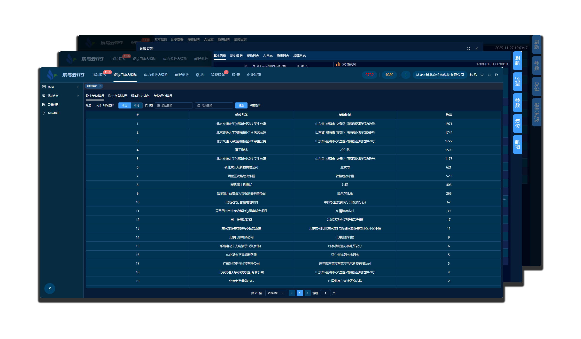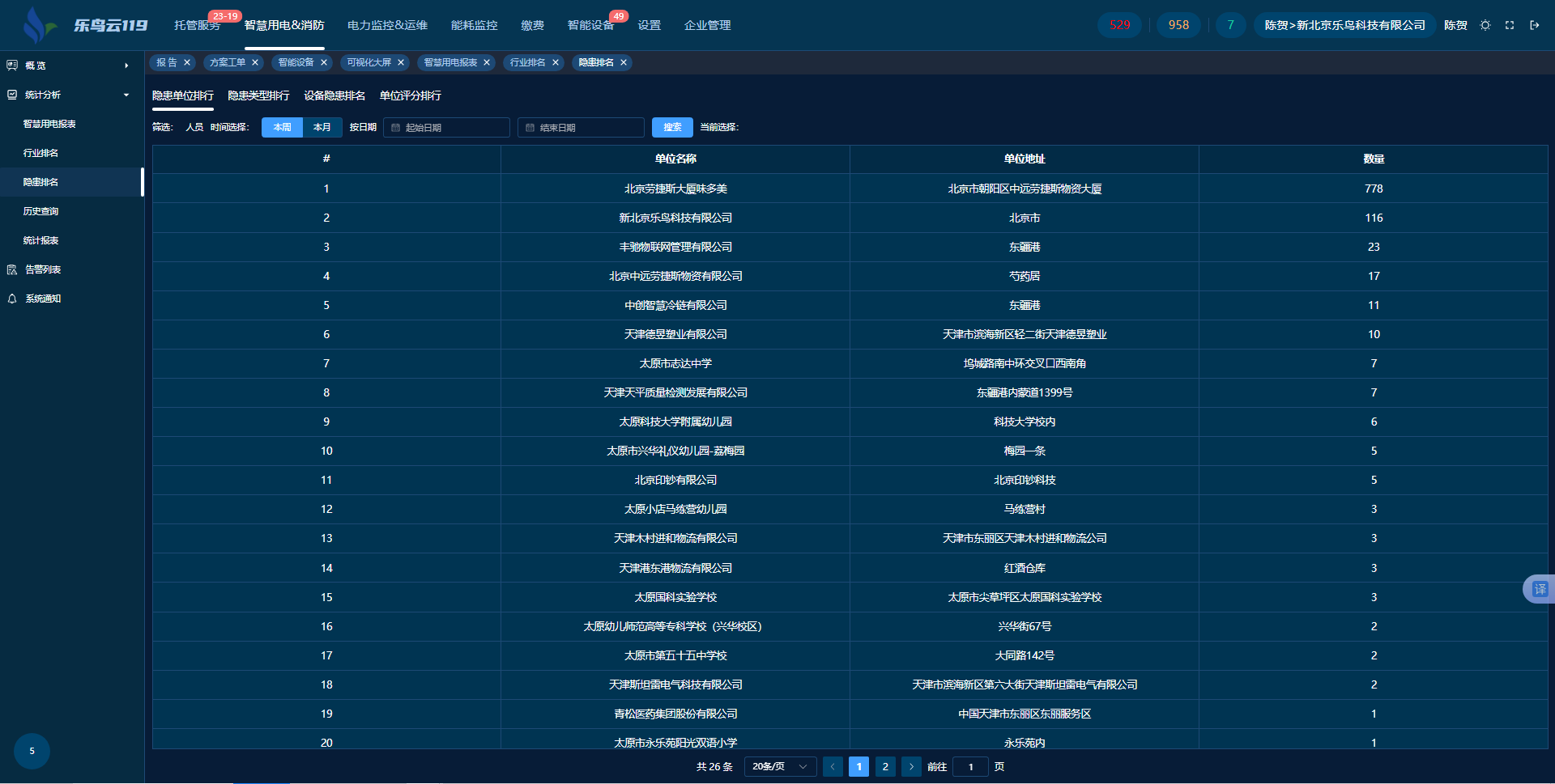 隱患單位排名:本周/本月內(nèi)單位下設(shè)備報(bào)警數(shù)量總和倒序排名。