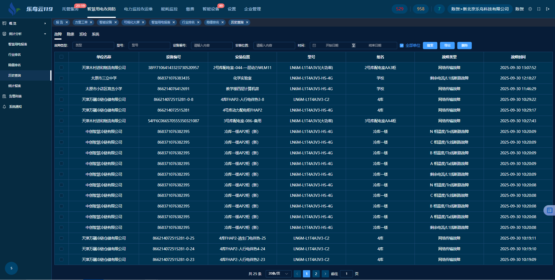 歷史查詢中有故障、隱患、巡檢、系統(tǒng)四個(gè)標(biāo)簽,可以篩選條件分別對(duì)四個(gè)標(biāo)簽進(jìn)行逐一查詢統(tǒng)計(jì),列表是按時(shí)間倒序進(jìn)行排列查詢的。